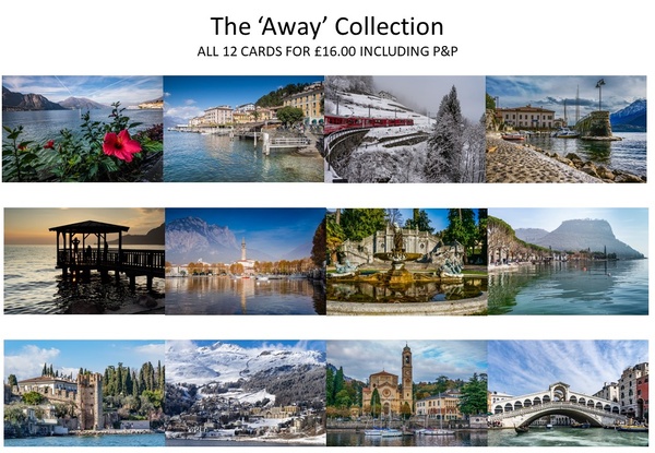 ‘Away’. This set features images from: Bellagio (two different), Bernina Express, Dongo, Garda, Lecco, Parco Civico Tremezzo, Rocca di Garda, Sirmione, St Moritz, Tremezzo and Venice.